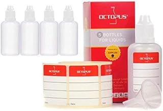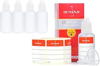 5 x 30 ml Octopus flacons compte-gouttes pour le dosage de liquides, e-liquides, solutions ophtalmiques, flacons LDPE vides en plastique transparent, flacons en plastique avec compte-gouttes blanc, avec sécurité enfants, 5 étiquettes personnelles incluses