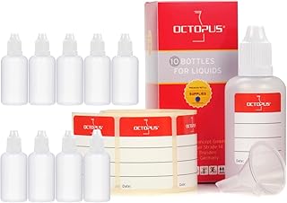 10 x 50 ml Octopus flacons compte-gouttes pour le dosage de liquides, e-liquides, solutions ophtalmiques, flacons LDPE vides en plastique transparent, flacons en plastique avec compte-gouttes blanc, avec sécurité enfants, 10 étiquettes personnelles incluses