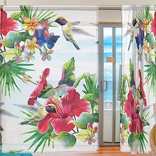 Ahomy Rideau de fenêtre en voilage à 2 panneaux aquarelle colibri fleurs tropicales en tulle pour salon, fenêtre, chambre à coucher, 198,1 x 139,7 cm