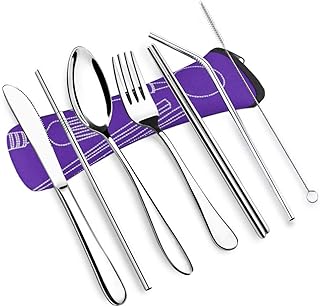 7CS Ménagères Assorties Acier Inoxydable Couverts deTable Camping Vaiselles Pique-Nique Fourchette+Couteau+Cuillère+Baguette+Paille Thé Glacé Vaisselles Cuisine Occidentale (Violet, Taille Unique)